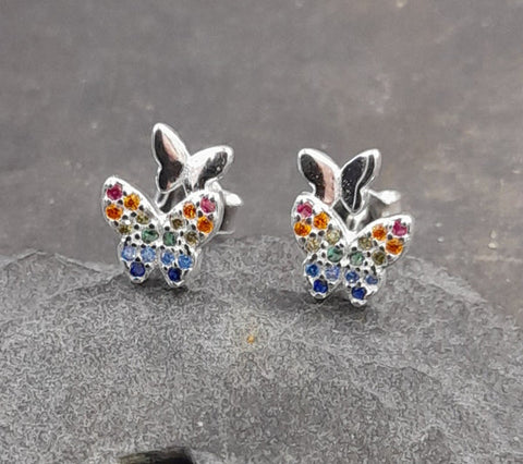 A Butterfly sitting on a Butterfly. Stunning Multi Coloured Cubic Zirconia Sterling Silver Stud Earrings