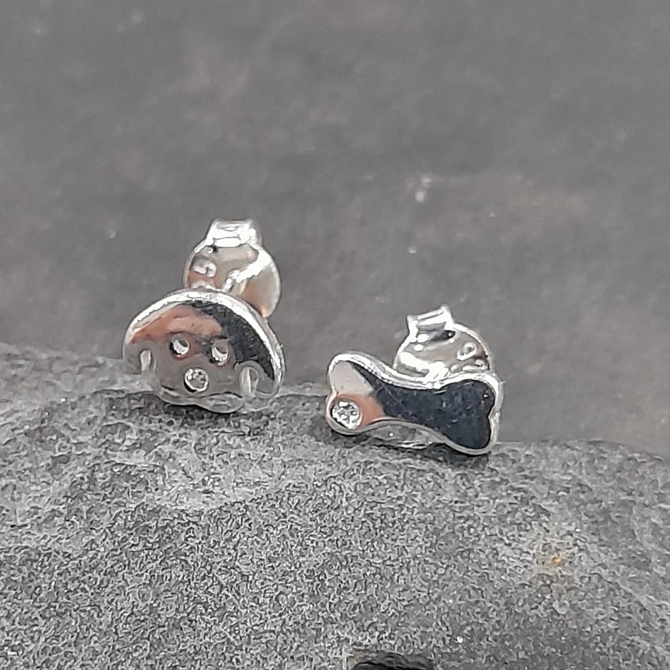 Dog and Bone Sterling Silver Stud Earrings. These each have a small clear Cubic Zirconia inset