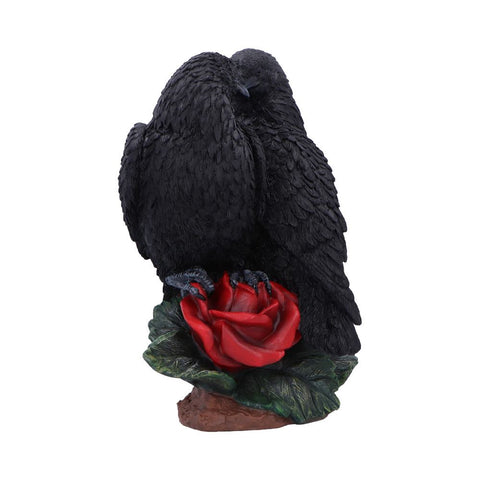 Celebrate love with Raven Romance, a stunning resin figurine featuring two intricately sculpted black ravens sitting close together atop deep red roses.